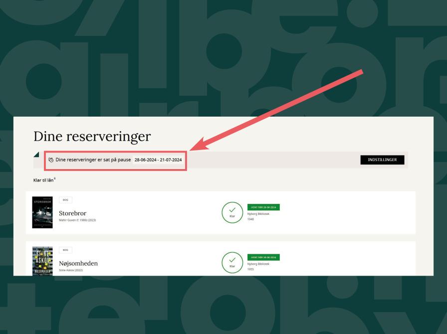 Bemærk også at pausefunktionen gælder for reserveringer - ikke for lån. Hvis du ønsker at forlænge et lån, skal du forny det på din lånerprofil.